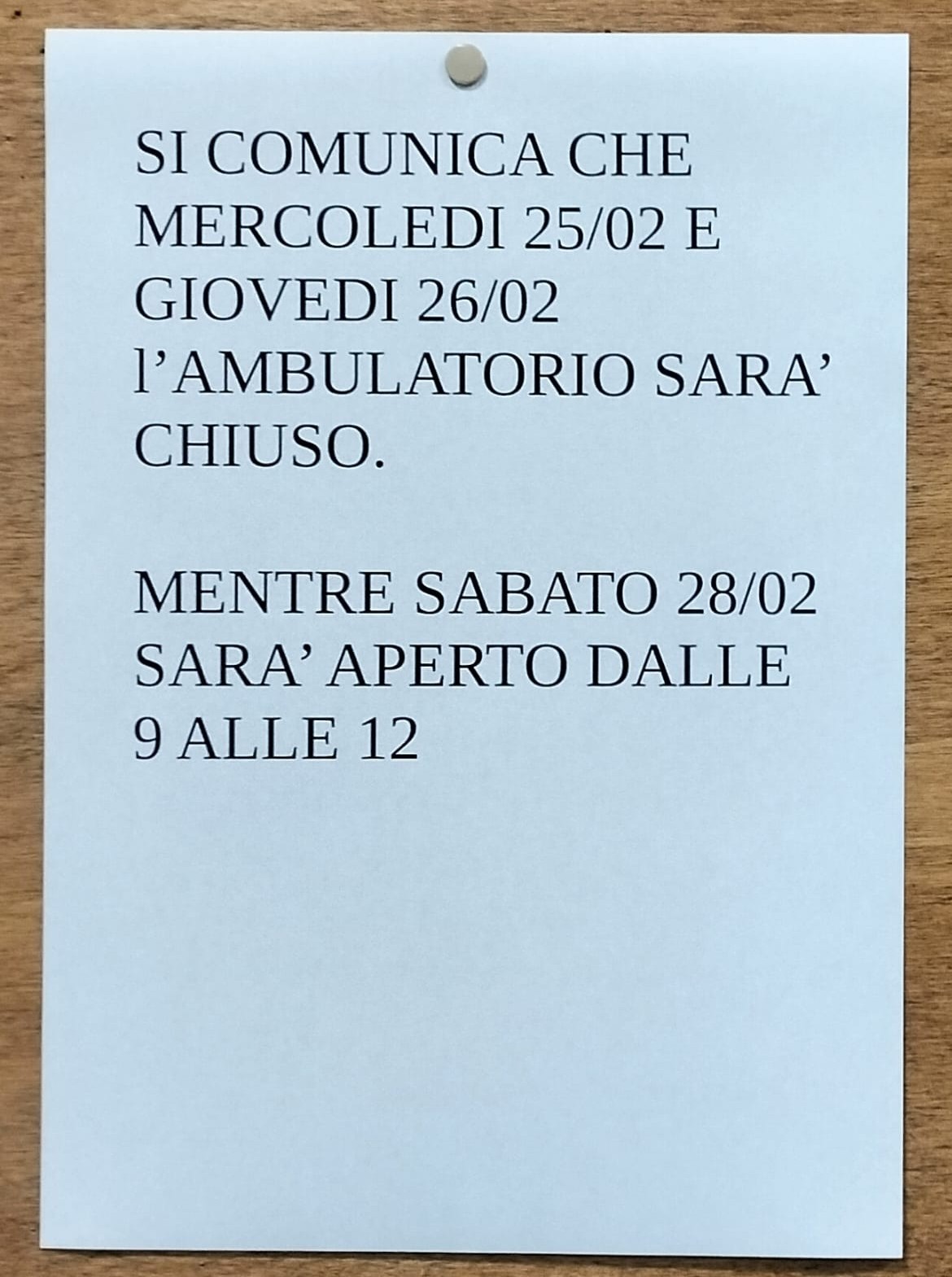 Si comunica che mercoledi 25/02 e giovedi 26/02 l'ambulatorio sarà chiuso.